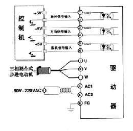 ★ 單/雙脈沖選擇 通過驅(qū)動器側(cè)板第6位開關(guān)可選擇單脈沖模式(第6位為‘ON’)或雙脈沖模式(第6位為‘OFF’)。單脈沖模式下步進脈沖由脈沖端口接入,由方向端口的電平高低決定電機的運轉(zhuǎn)方向;雙脈沖模式下,驅(qū)動器從脈沖端口接收正轉(zhuǎn)脈沖,從方向端口接收反轉(zhuǎn)脈沖。無論是單脈沖還是雙脈沖都以光耦從截止到導通作為有效接受信號,請根據(jù)實際的接線注意有效電平。 注:用戶對單/雙脈沖模式的更改必須在上電前需給驅(qū)動器重新上電方可生效。 ★ 自動半電流 通過驅(qū)動器側(cè)板第5位撥碼開關(guān)可選擇是否開放自動半電流功能,當?shù)?位撥碼開關(guān)設(shè)為‘ON’時,驅(qū)動器工作若連續(xù)1 秒沒有接到新的脈沖則自動進入半電流狀態(tài),相電流降低為標準值的50%,達到降低功耗的目的,在收到新的脈沖時驅(qū)動器自動退出半電流狀態(tài)。 注:用戶對半流功能的更改無須給驅(qū)動器重新上電即可生效。 ★ 脫機功能 輸入脫機信號時,驅(qū)動器將切斷電機各相繞組電流使電機軸處于自由狀態(tài),此時步進脈沖將不能被響應(yīng)。此狀態(tài)可有效降低驅(qū)動器和電機的功耗和溫升。脫機控制信號撤消后驅(qū)動器自動恢復(fù)到脫機前的相序并恢復(fù)電機電流。當不需用此功能時,脫機端可懸空。 輸 入 信 號 驅(qū)動器的接線端子采用可拔插端子,可以先將其撥下,接好線后再插上。本驅(qū)動器的輸入信號采用雙端接口,可以滿足共陰、共陽、差分等多種接口形式。 脈沖信號輸入 驅(qū)動器端口內(nèi)置光耦,光耦導通一次被驅(qū)動器解釋為一個有效脈沖。對于共陽極而 言低電平為有效(共陰為高電平有效),此時驅(qū)動器將按照相應(yīng)的時序驅(qū)動電機運行一步。單脈沖模式時此信號端作為脈沖輸入信號,雙脈沖模式時此信號端作為正轉(zhuǎn)脈沖輸入信號。為了確保脈沖信號的可靠響應(yīng),光耦每次導通的持續(xù)時間不應(yīng)少于5μs。本驅(qū)動器的信號響應(yīng)頻率為80KHz,過高的輸入頻率將可能得不到正確響應(yīng)。 方向信號輸入 單脈沖模式下該信號作為控制電機的轉(zhuǎn)向信號,該端內(nèi)部光耦的通、斷被解釋為控制電機運行的兩個方向??刂齐姍C轉(zhuǎn)向時,應(yīng)確保方向信號領(lǐng)先脈沖信號至少10μs 建立,從而避免驅(qū)動器對脈沖的錯誤響應(yīng)。雙脈沖模式下,該信號作為反轉(zhuǎn)的脈沖輸入信號,光耦導通一次被驅(qū)動器解釋為一個有效脈沖。為了確保脈沖信號的可靠響應(yīng),光耦每次導通的持續(xù)時間不應(yīng)少于10μs。 脫機信號輸入 內(nèi)部光耦處于導通狀態(tài)時電機相電流被切斷,轉(zhuǎn)子處于自由狀態(tài)(脫機狀態(tài))。光耦關(guān)斷后電機電流恢復(fù)到脫機前的大小和方向。當不需用此功能時,脫機信號端可懸空。 典型接線圖 注意: 為了更好的使用本驅(qū)動器,用戶在系統(tǒng)接線時應(yīng)遵循功率線(電機相線,電源線)與弱電信號線分開的原則,以避免控制信號被干。在無法分別布線或有強干擾源(變頻器,電磁閥等)存在的情況下,最好使用屏蔽電纜傳送控制信號;采用較高電平的控制信號對抵 抗干擾也有一定的意義。為確保使用者安全,請務(wù)必使用線徑2mm2以上的機殼保護線和驅(qū)動器的機殼接地端子與保護大地可靠連接,并采用隔離變壓器為驅(qū)動器供電。 |