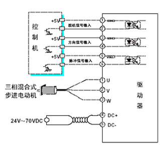 輸 入 接 口  | 注意: 當控制信號不是TTL 電平時,應(yīng)根據(jù) 信號電壓大小在各信號輸入端口(非公共端) 外串限流電阻,如24V 時,外串2KΩ電阻。每路信號都要使用單獨的限流電阻。 |